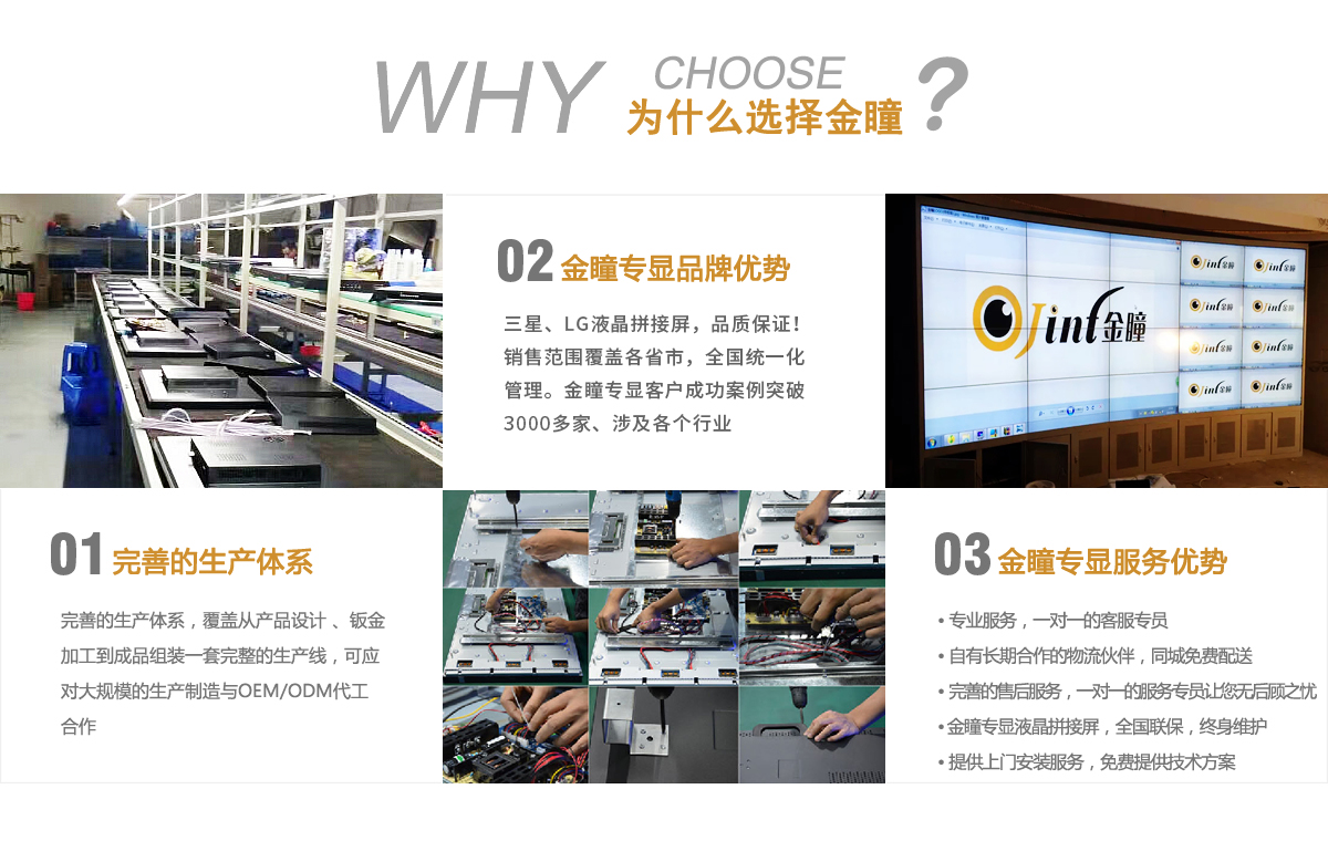 深圳市金瞳專顯科技有限公司成立于2010年,總部坐落于深圳。公司是一家專業從事液晶拼接屏、監視器、廣告機、觸控一體機、排隊叫號機等人機互動顯示技術的研發、生產、銷售、服務為一體的企業,主營拼接大屏、無縫拼接屏、LED/4K/46寸/55寸/高清液晶拼接屏、超窄邊液晶拼接屏等設備。